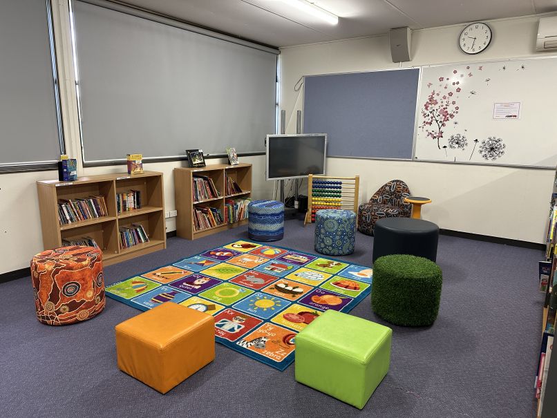 Our library contains a range of learning spaces, including a circle time set up with an indigenous themed - 'Yarn Circle.'
